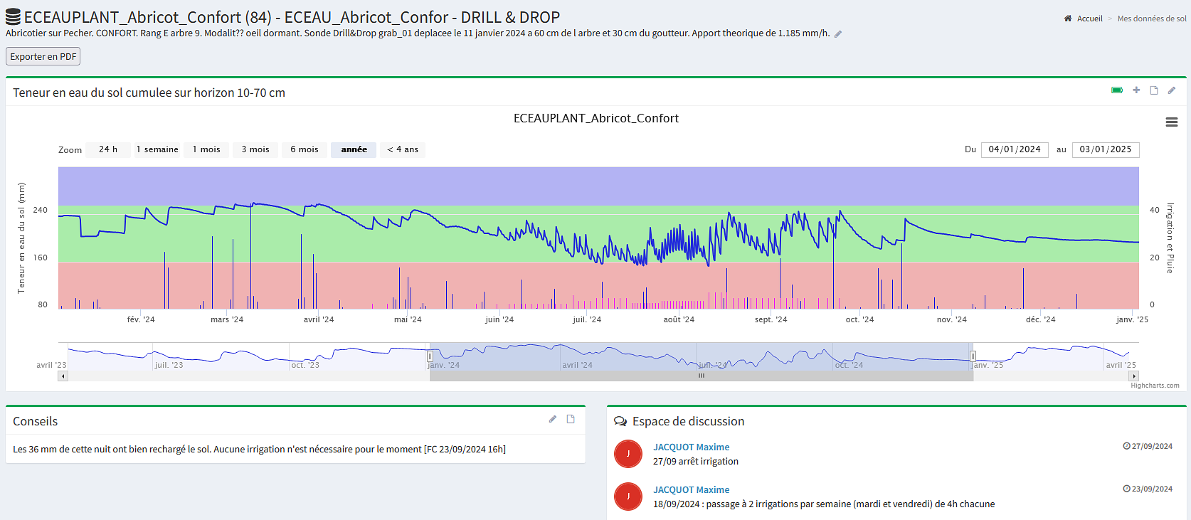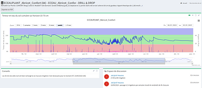 - la version privée, avec codes d’accès, est destinée aux sondes installées sur des parcelles irriguées (qui deviennent des cas particuliers). Cet OAD (Outil d’Aide à la Décision) permet d’aider les agriculteurs à piloter au mieux leur irrigation. On peut y échanger des conseils, des observations, saisir les irrigations… Chaque agriculteur bénéficie d’un accompagnement personnalisé pour comprendre les résultats et ajuster ses apports d’eau. L’objectif est d’éviter le stress hydrique des cultures tout en économisant de l’eau. Cette méthode s’inscrit dans une démarche d’agriculture performante et respectueuse des ressources.