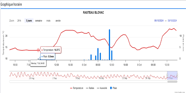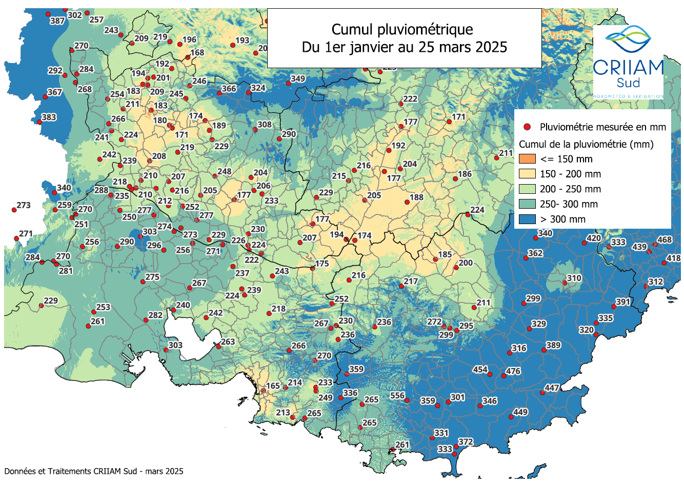Bilan climatique spatialisé : cumul pluviométrique sur une période, nombre de jours de gel, sommes de températures.