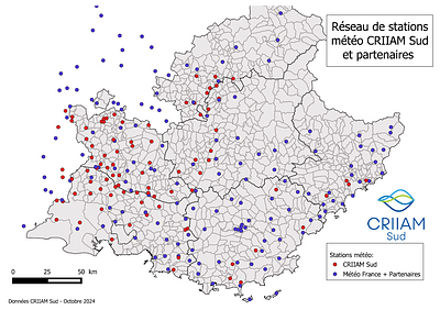 Grâce à son expertise en agrométéorologie et en gestion de bases de données, le CRIIAM Sud est également en mesure d’intégrer des données issues d’autres réseaux, physiques ou virtuels. Cette capacité d’adaptation et d’ouverture lui permet d’étendre l’utilisation de ses outils d’aide à la décision au-delà du territoire couvert par ses propres stations.