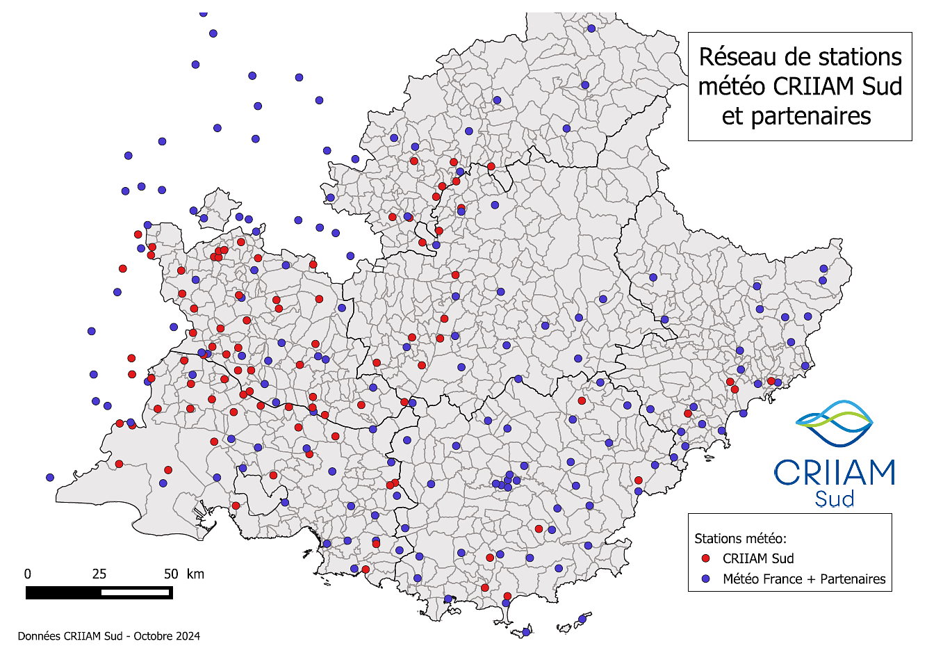 Le CRIIAM Sud gère un vaste réseau de stations météorologiques, principalement implantées en zones agricoles. Ce réseau est composé d’une centaine de stations appartenant au CRIIAM Sud ou à ses partenaires. Elle sont réparties sur les six départements de la région Sud et ses environs, offrent une densité d'observation exceptionnelle, qui surpasse celle de Météo France dans certains secteurs. Ce réseau constitue ainsi un atout majeur pour une couverture météorologique optimale au service de l’agriculture régionale.